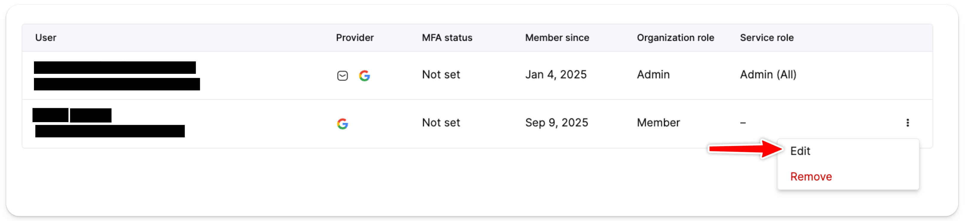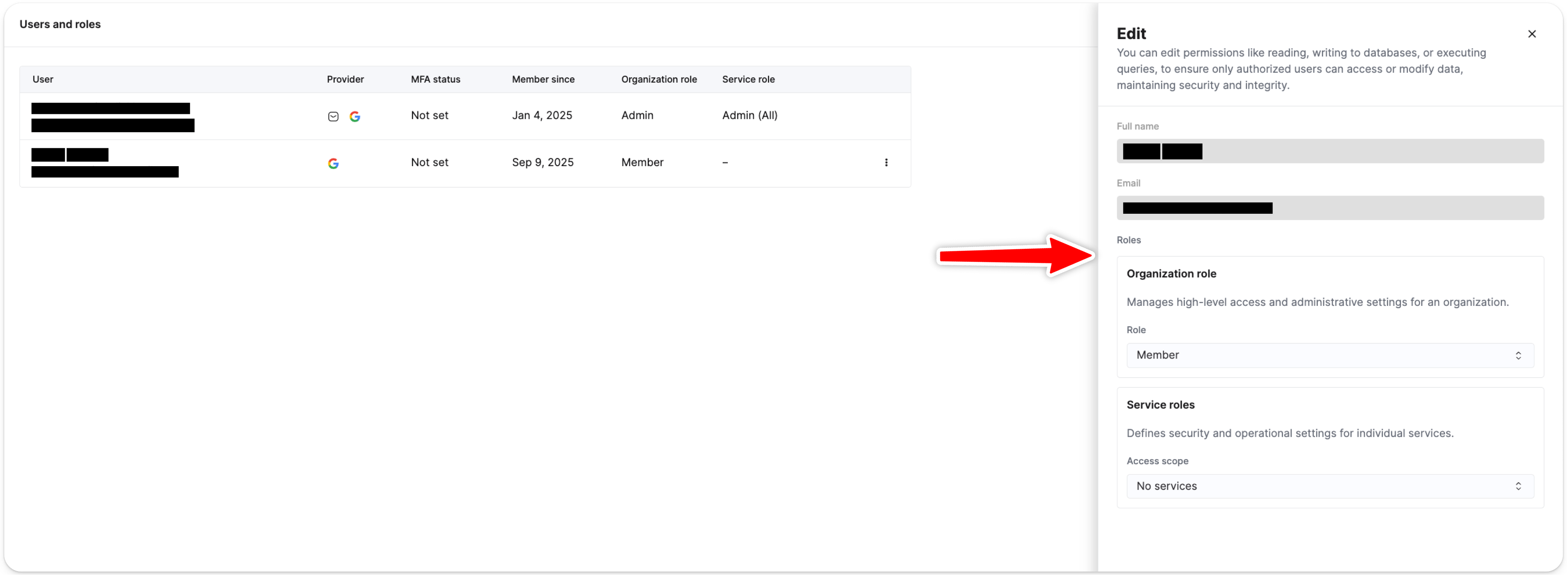 Select the drop-down menu items to adjust the access scope of the service role of the selected user. When selecting Specific services