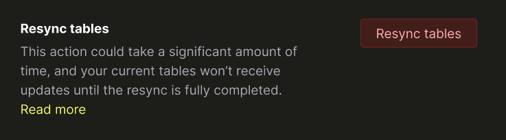- Возможно, вам потребуется выполнить значительные изменения в схеме исходных таблиц, что приведет к сбоям в существующем ClickPipe, и вам нужно будет перезапустить его. Вы можете просто нажать Resync после внесения изменений.